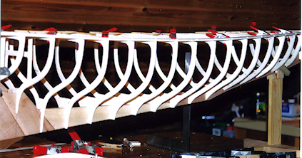 Fast jeder Holzbootsbau beginnt mit der Herstellung des Spantengerüstes. Es bildet den filigranen formgebenden Grundkörper für die Planken, die zum Erreichen der erforderlichen Festigkeit und Steifigkeit später mit in Epoxydharz getränktem Glasfasergewebe überzogen werden.