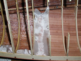 Für eine Innenbeschichtung reicht ein dünnes Glasfasergewebe mit einem Gewicht von ca. 40 bis 80 g/m2 vollkommen aus. Man schneidet es in Streifen, deren Breite dem Spantabstand möglichst genau entspricht. Das erspart Zeit und minimiert die Gefahr von Lufteinschlüssen beim Laminieren gegenüber breiteren, seitlich an den Spanten hochgezogenen Gewebestreifen. Schneidet man die Streifen etwas breiter als es dem Spantabstand entsprechen würde zu, muss das Gewebe in der Ecke am Spant mehrmals herangedrückt werden, sogar noch während des Aushärtens. Auf diese Weise werden allerdings die Spanten an deren Übergängen zum Rumpf fest einlaminiert, was die Gesamtstabilität erhöht.
