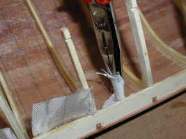 Ist dieser Vorgang beendet und die Planken schmiegen sich aneinander, ist der Verlauf im Heckbereich zu kontrollieren. Hier genügt eine grobe Kontrolle, ob der ausgearbeitete Plankenverlauf in etwa passt oder größere Korrekturen vonnöten sind. Bei größeren Abweichungen sollte man die Planke abnehmen, nacharbeiten und diese erneut wie beschrieben anlegen. Ansonsten kann mit dem Einkleben begonnen werden. Dazu ist zunächst auf jeden Spant entsprechend der Plankenbreite etwas Weißleim aufzubringen.