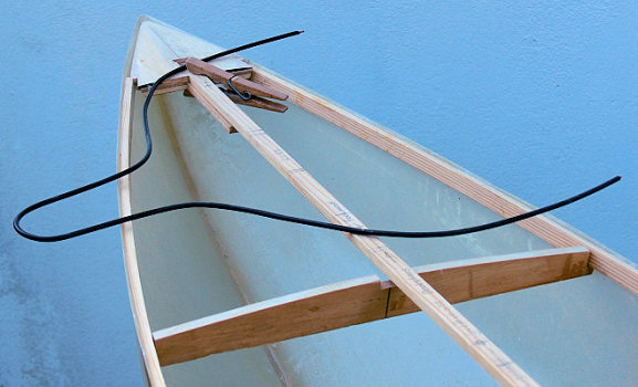 Um die Berechnung des Modells durchführen zu können, braucht man nur noch die Form und die Fläche des Spants in Erfahrung zu bringen, in dessen Ebene der Verdrängungsschwerpunkt liegt. An der entsprechenden Stelle des Rumpfes wird an die Rumpfwand ein Stäck weicher Kupferdraht so lange angeformt, bis sein Verlauf dem der Rumpfwand entspricht (Bild 19.15). Dabei kontrolliert man nicht nur den Verlauf an sich, sondern auch die Rechtwinkligkeit zur Mittschiffslinie und zur Konstruktionswasserlinie.